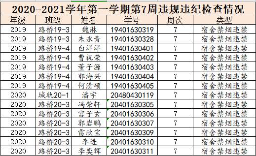 现将学院2020-2021学年第一学期第7周的文明修身检查结果进行通报,希望广大同学引以为戒。