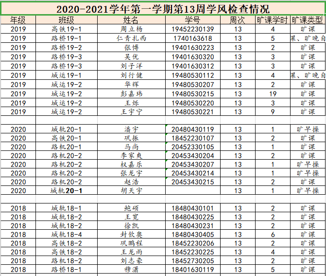 现将学院2020-2021学年第一学期第13周的文明修身检查结果进行通报,希望广大同学引以为戒。