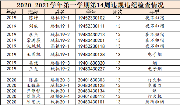 现将学院2020-2021学年第一学期第14周的文明修身检查结果进行通报,希望广大同学引以为戒。