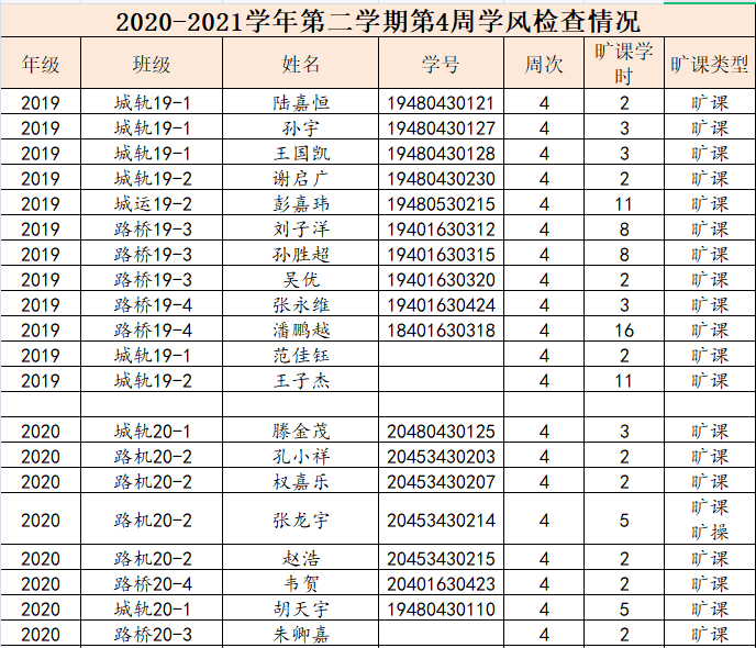 现将学院2020-2021学年第二学期第4周的文明修身检查结果进行通报,希望广大同学引以为戒。